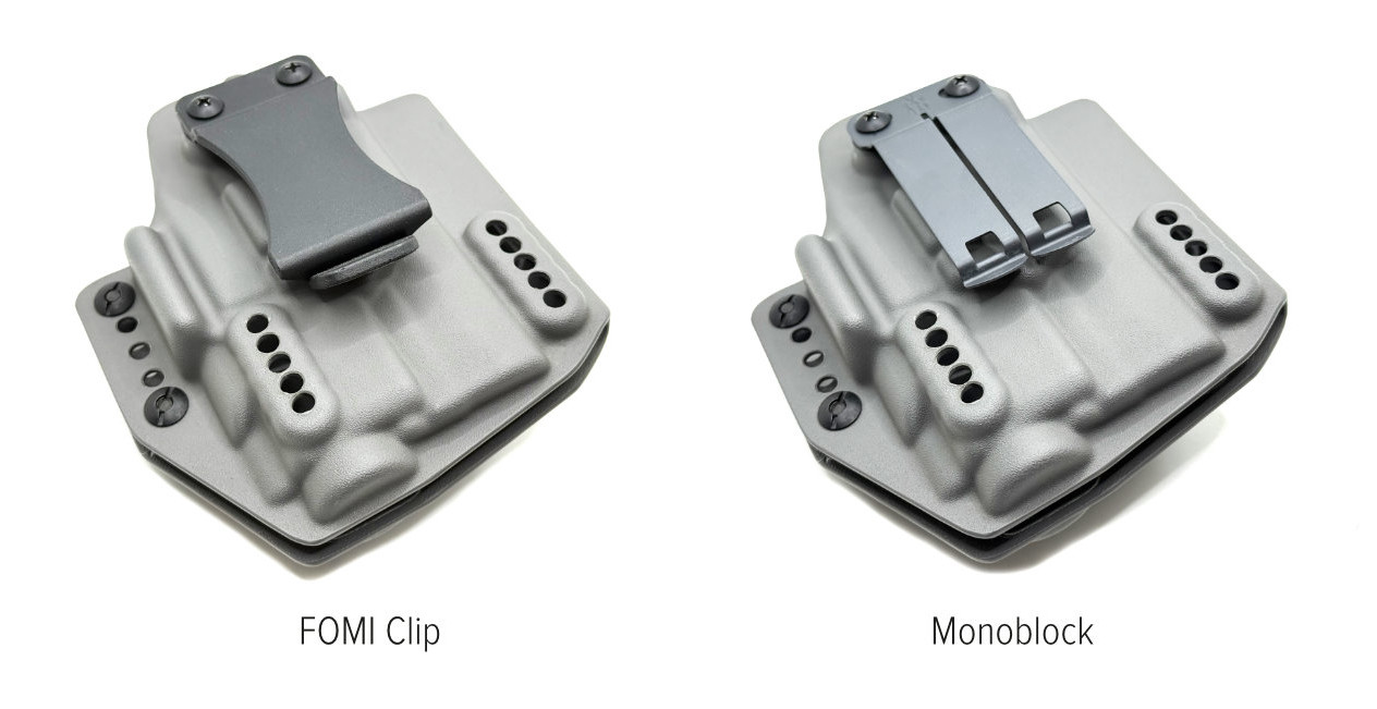 V klasické IWB konfiguraci pro vnitřní nošení je možné k pouzdru přimontovat všechny úchyty jako k našim IWB pouzdrům. Tzn. polymerové FOMI, nebo špičkové ocelové Monoblock klipy pro opasky šířek 1,5" (40 mm) nebo 1,75" (45 mm) s možností náklonu (0° nebo cca 20° dopředu). Nebo je možné použít UltiTuck nebo poutka Soft Loops.