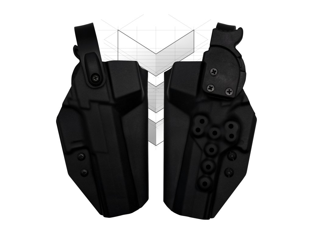 Rozhodli jsme se nepoužít zde známé pojistky BladeTech WRS, které je pro odjištění nutné "ohnout", často je třeba je přibrušovat a ladit pro optimální chod, a které namáhají konstrukci pouzdra. Naše služební pouzdra modelové řady DUTY vybavujeme pojistkami SpeedLock americké značky SpetzGear, které pracují na odlišném principu. Palcem se stlačí kyvná páčka/tlačítko, a pojistka odskočí. Není třeba překonávat odpor jako u BladeTechu, chod je hladký, odjištění je přesné, rychlé a čitelné. Pokud byste přeci jen trvali na pojistce BladeTech, napište nám do poznámky k objednávce a namontujeme vám ten. Rozteče šroubů jsou stejné, cena také.